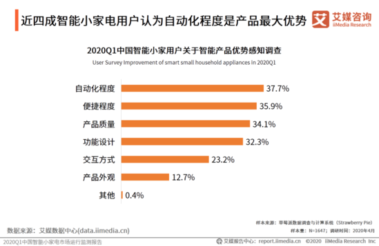 根据iiMedia Research(艾媒咨询)数据显示,智能小家电产品在提升效率和操作简便方面的优势更契合消费者需求痛点,分别有37.7%及35.9%的受访智能小家电用户认为相较于传统小家电,智能产品在自动化程度、便捷程度方面优势最大。各细分品类智能小家电产品中,居家类产品的智能程度最受认可,43.7%的受访者认为居家类智能小家电智能程度最高。同时,艾媒咨询预测2020年智能音箱产品的销量预计高达5910.5万台,销售增长率超过96%。而智能马桶以及扫地机器人的销量在2020年则有望达到821.0万台和882.0万台。可以看到,这些智能小家电已经切实改变了我们的生活。