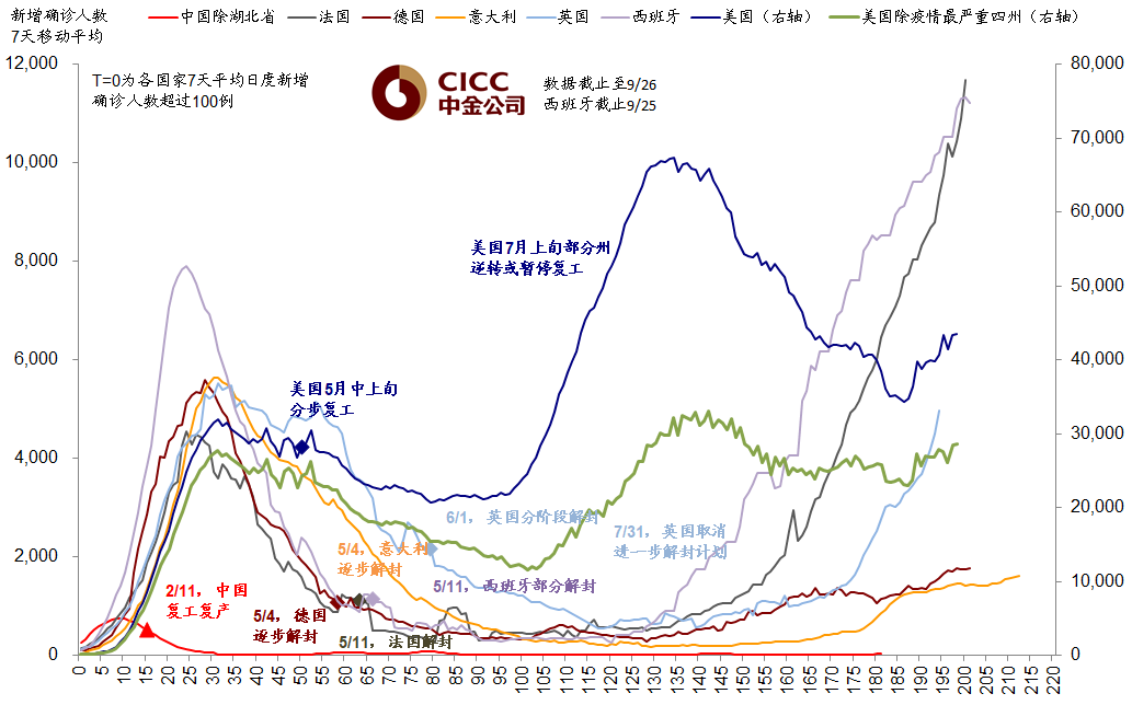 欧美近期增长动能相比前几个月略有所放缓,特别是服务业。欧元区9月服务业PMI再度降至收缩区间,体现了公共卫生事件的影响,但制造业维持强劲。美国也是如此,制造业PMI继续抬升,但服务业回落;耐用品订单也有所趋缓,这都可能使得当前波动格局延续。