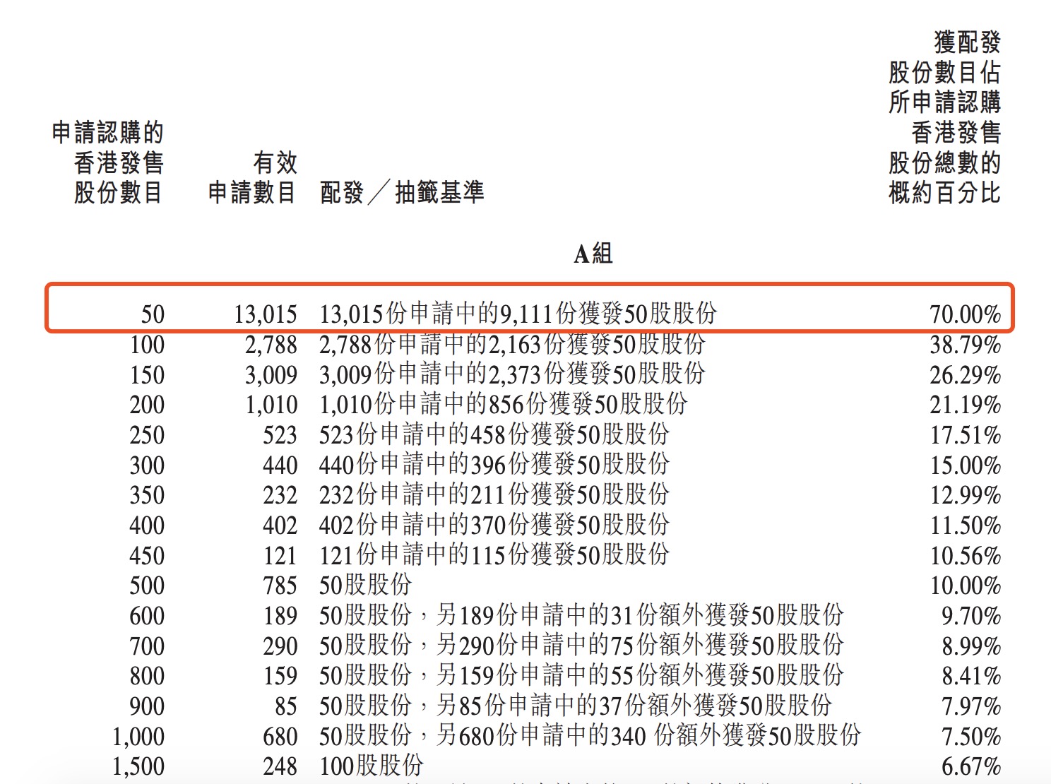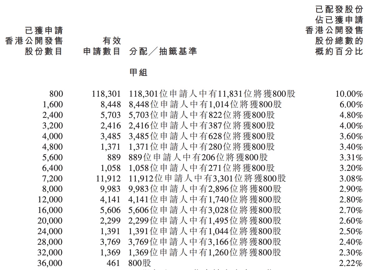 香港公开发售项下初步可供认购的香港发售股份获轻微超额认购。共接获1.23万份提出的有效申请,认购合共1441.22万股香港发售股份,相当于香港公开发售项下初步可供认购香港发售股份总数400万股的约3.60倍。