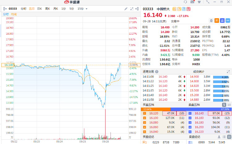 中国恒大(3333.HK)今日迎强势反弹,午后涨幅进一步扩大,一度涨19.59%报16.48港元,已收复上周失地。