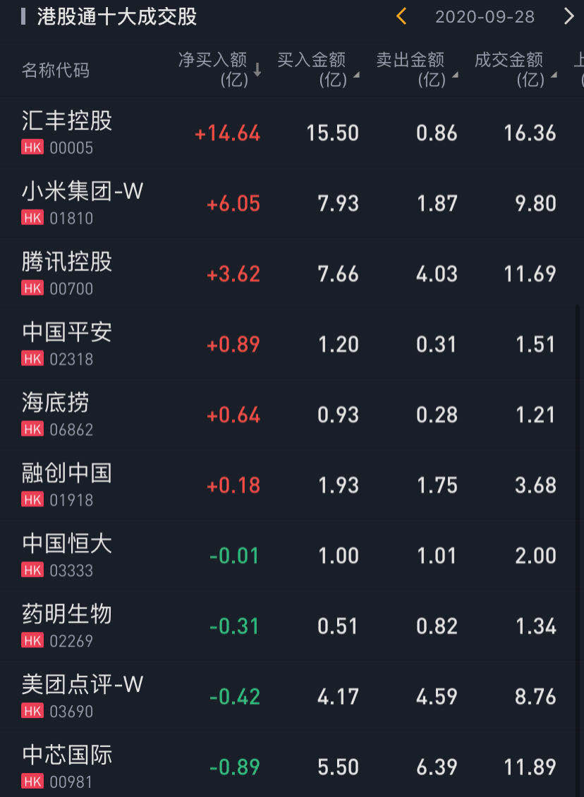 个股方面,今日南下资金净买入汇丰控股14.64亿港元,净买入小米集团-W6.05亿港元。