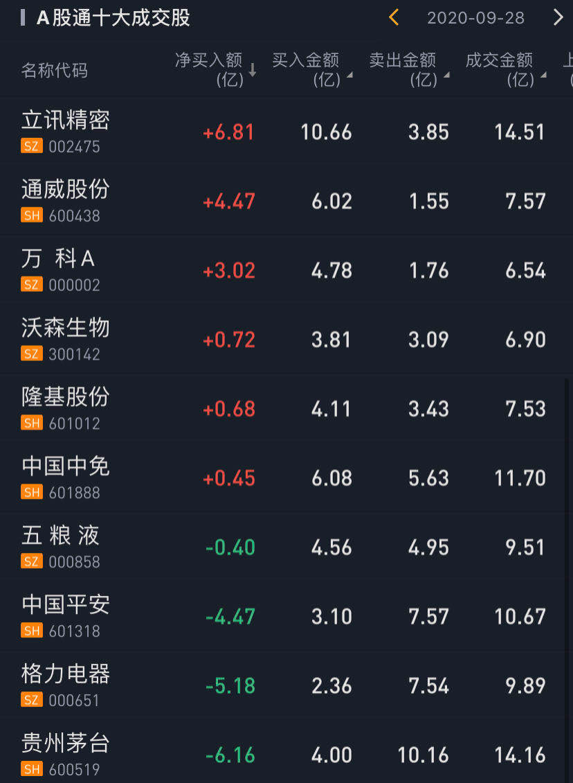 北上资金今日净买入立讯精密6.81亿元,净买入通威股份4.47亿元,净买入万科A3.02亿元;净卖出贵州茅台6.16亿元。