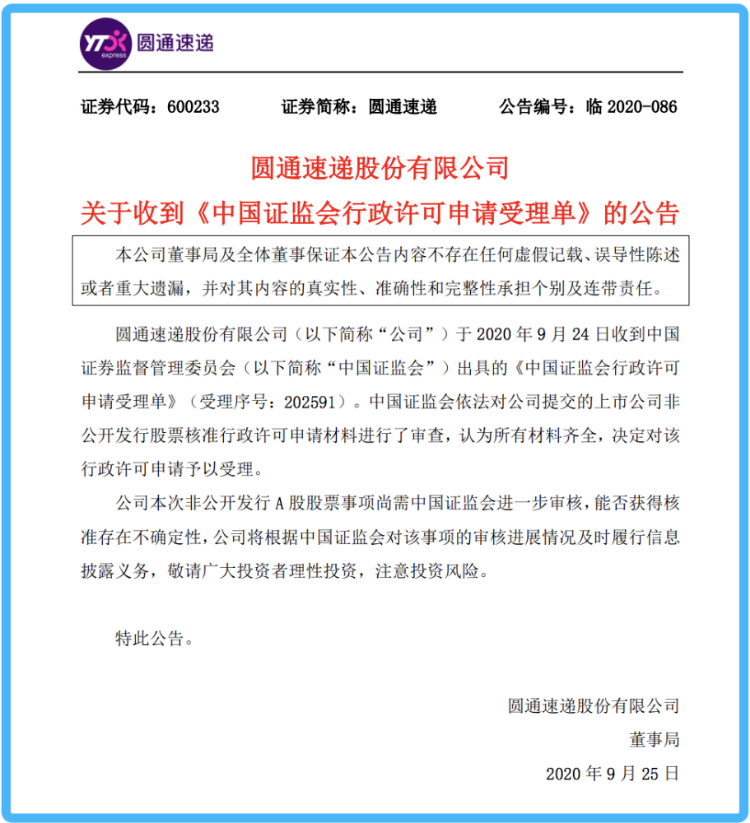 9月24日,圆通速递公告称,公司非公开发行股票申请获证监会受理。据悉,圆通速递本次定增拟募集资金总额不超过45亿元。