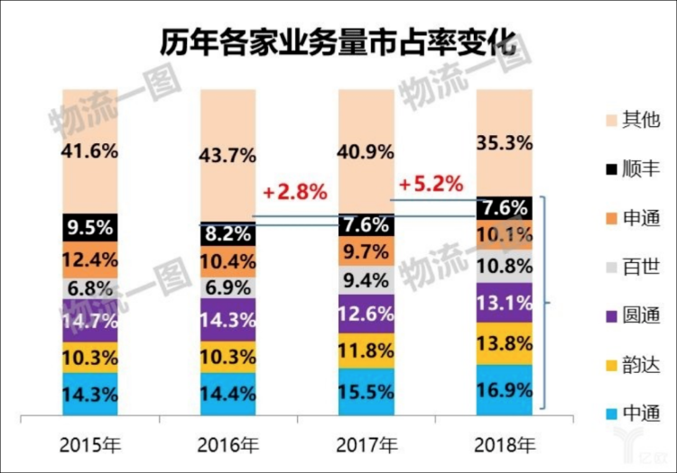 2015年-2018年头部快递企业业务量市占率变化(图片来源:物流一图)