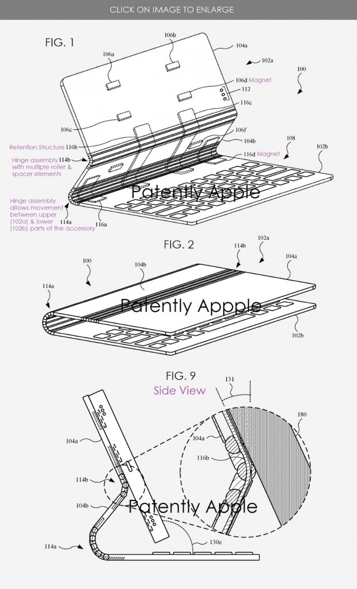 微软Surface Book采用了创新的铰链设计,允许屏幕与键盘分离。显示屏组件内有自己的电池,因此它可以在没有键盘的情况下独立运行,完全依靠触摸输入。而根据Patently Apple发现的一项新专利,苹果可能会探索类似的方法,推出一款新的MacBook设计,包括多滚轮铰链系统和可能的可拆卸屏幕。