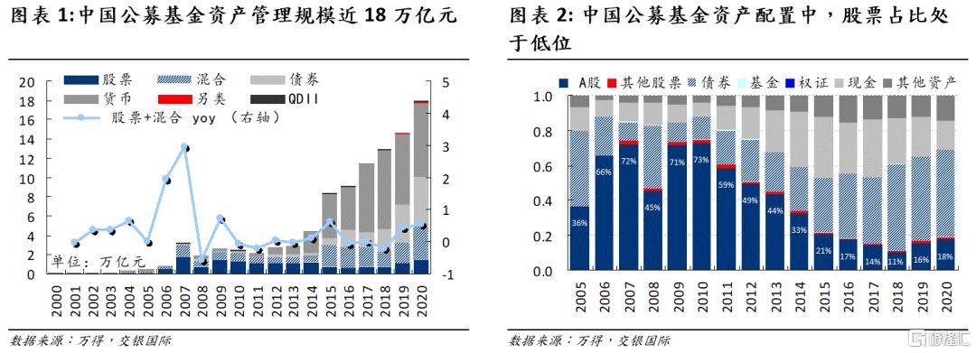 中国公募基金经过20多年的发展,资产管理规模接近18万亿元(人民币,下同)。但是,过去十年,货币类与债券类基金规模复合年增长率分别达到43%和38%,普通股票型公募基金年复合增长率却不足1%。与此同时,中国股市的流通市值从2010年的14万亿成长到60万亿元。中国市场的资产配置发生了根本的模式变化:虽然公募基金对股票的配置比例不断下降,现在只占公募基金资产配置的18%,但其他形式的基金和投资渠道吸收了新增的大部分股票和债券。同时,中国的资产配置从十多年前大部分的股票配置,到现在货币和债券配置,体现了投资配置的多元化。