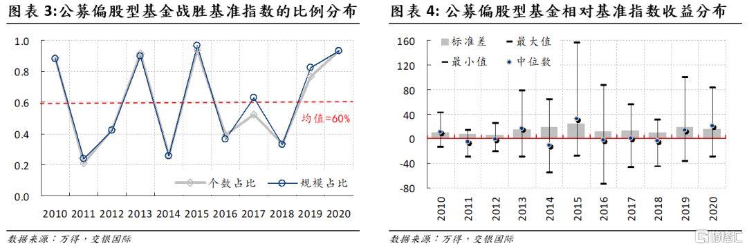 我们还发现公募偏股型基金经理的业绩大小年相间:一个大年,也就是80%以上的基金经理跑赢基准指数的年份,往往跟随着一个小年,这时只有约20%的经理能够跑赢基准指数。2019年和2020年是两个非常不寻常的年份。这两年都是基金经理的大年——这是过去十年以来的首次。虽然我们为基金经理这两年的优秀成绩点赞,但是这个历史性的异象也增加了明年获得超额回报的难度和市场回报均值回归的概率。