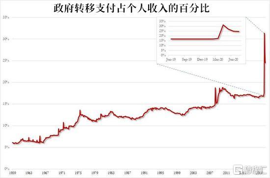 相比之下,上世纪五、六十年代,政府转移支付约为7%。这一数字在20世纪70年代中期开始上升(即在布雷顿森林体系瓦解后不久)。08年金融危机后,这一数字再次飙升。在今年4月,新冠疫情下该数字曾达到创纪录的31%,目前已回落至20%左右。