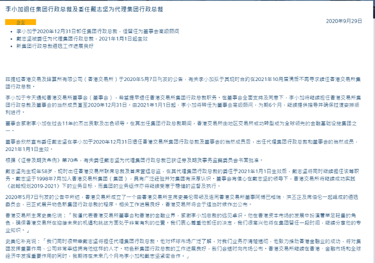 董事会欣然宣布委任戴志坚在李小加于2020年12月31日退任香港交易所集团行政总裁及董事会的当然成员后,出任代理集团行政总裁和董事会的当然成员,2021年1月1日生效。