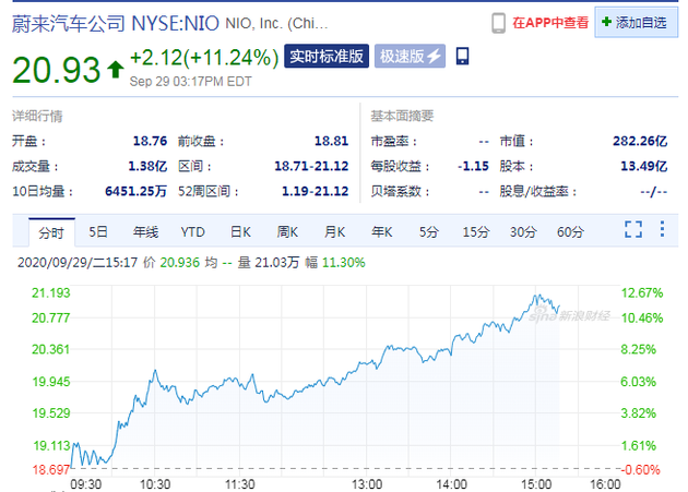 新浪科技讯 9月30日凌晨消息,蔚来汽车盘中涨超12%,股价刷新历史新高,至21.12美元。截至发稿,蔚来汽车涨11.24%报20.93美元,市值282.43亿美元。