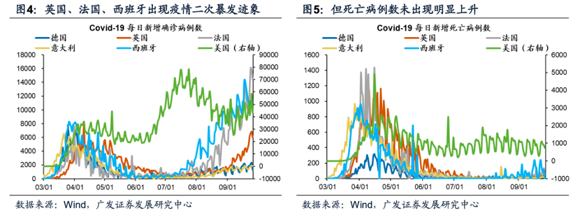 8月开始,欧洲疫情卷土重来,西班牙、法国及英国每日新增确诊病例数开始急剧增长,而意大利和德国新增病例增长仍得到控制。截至当下,西班牙、法国、英国新增病例数已经超过4月份疫情高峰期,美国新增呢病例也有所增长。死亡病例数并未出现明显增加,主要与医疗物资与应对手段的提升有关。