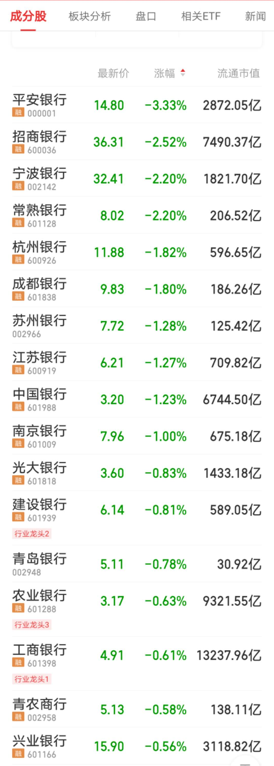 当日,从A股上市银行股表现来看,整个板块下跌0.67%,仅有4家银行股飘红。下跌的银行股中,平安银行跌幅最大,收盘下跌3.33%,收于14.8元。此前被市场看好的招商银行(600036.SH)、宁波银行(002142.SZ)、常熟银行(601128.SH)跌幅也均超过2%。