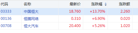 9月30日消息,恒大系走高,中国恒大涨13%,恒大汽车涨5.26%,恒腾网络涨6.9%。