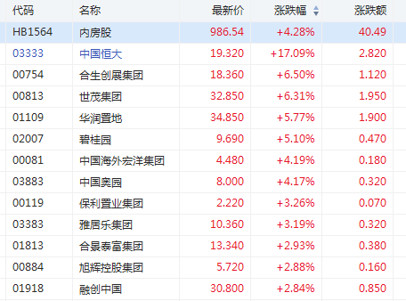 恒大重组警报解除,地产股暴力反弹,中国恒大涨17%,世茂涨6%,华润置地涨超5%,碧桂园涨超5%。