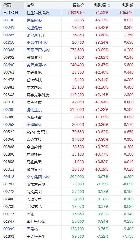 恒大系股票恒腾网络涨超5%领涨指数;阿里健康涨超4%,小米集团、阿里巴巴、比亚迪电子涨超3%,美团点评、中芯国际涨超2%,腾讯涨超1%。