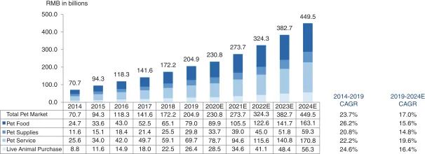 Frost&Sullivan提到,虽然2019年中国宠物行业的市场规模为2049亿元,预计2024年将以17%的CAGR大幅增长至6466亿元。