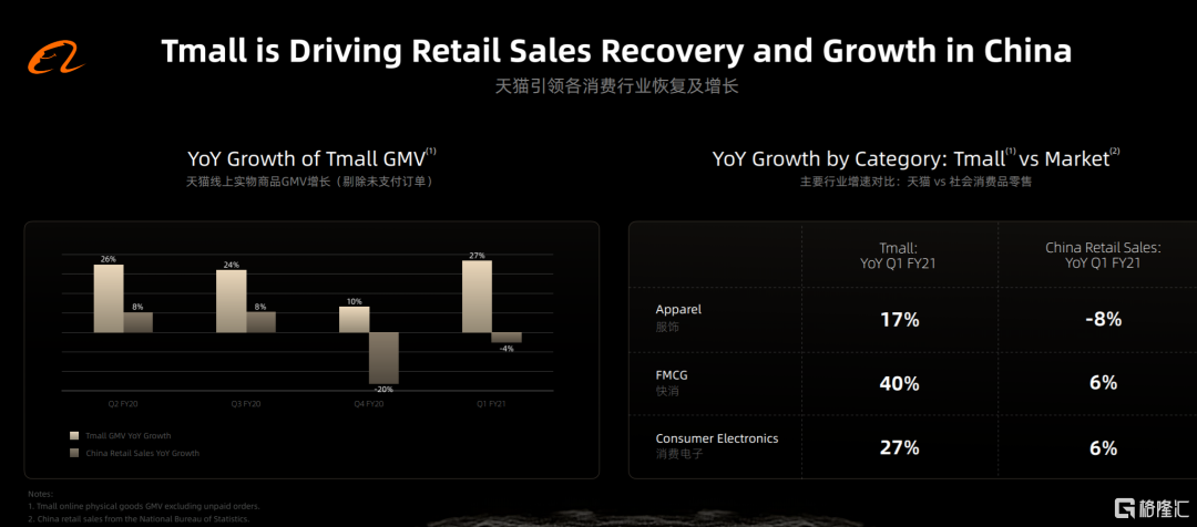 虽然在国内疫情相对严重的第一季度,天猫线上受到了一些影响,但从4月开始,天猫线上实物交易开始强势反弹,到2021财年一季度(即自然年2020年第二季度),整个天猫的线上实物成交已经恢复到了疫情前的水平,达到了27%。
