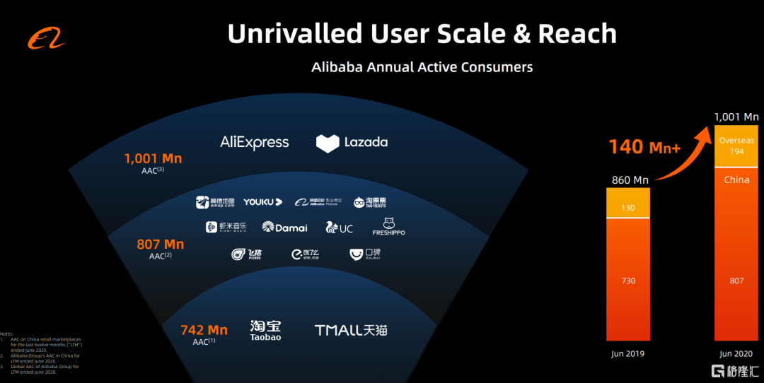 阿里巴巴公布,截至6月30日的过去12个月内,实现了10亿全球AAC(年度活跃消费者);其中中国市场的年度活跃消费者超过8亿,海外市场达到2亿。