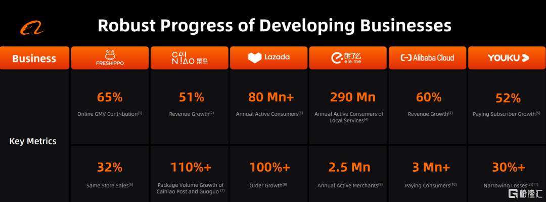 在这些业务中,尤其值得注意的是阿里云与菜鸟:阿里云将在2021财年内实现盈利,菜鸟的经营活动现金流将在2021财年转正。