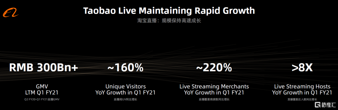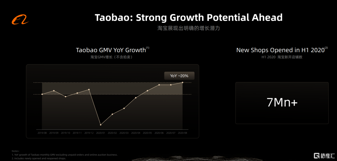 淘宝方面,也在疫情后迎来了快速反弹,8月份整个淘宝的GMV增速已经达到了约20%的水平,不但超过了疫情前的水平,也基本上是过去一年整个淘宝增速最快的的水平。