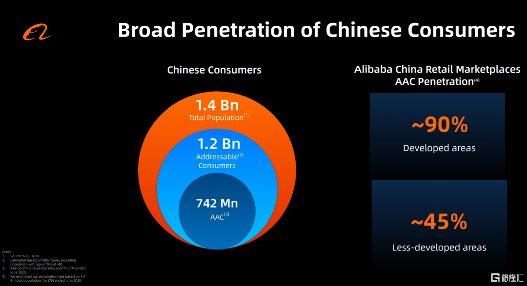 与阿里自己的目标相比,消费者基数还有不小增长空间。阿里认为中国估计有12亿消费者用户(14亿人口剔除80岁以上老人和10岁以下的孩童后得到),但目前的中国消费者规模还是8亿多,这之间还有增长潜力。