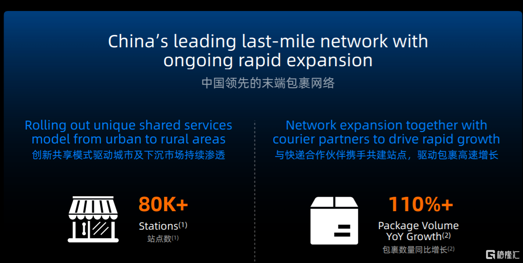 菜鸟网络上菜鸟裹裹和菜鸟驿站的包裹处理量在过去12个月中增长了110%;