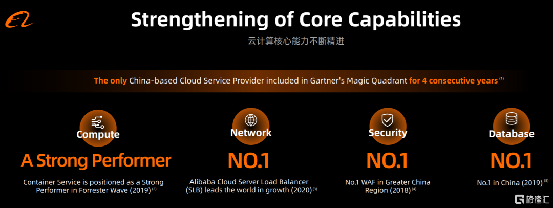 在投资者日上,阿里方面表示,阿里云的云计算核心能力仍在不断精进,诸如在网络安全,在高性能的网络,在数据库等等一些核心的云产品上面得到了显著进展。