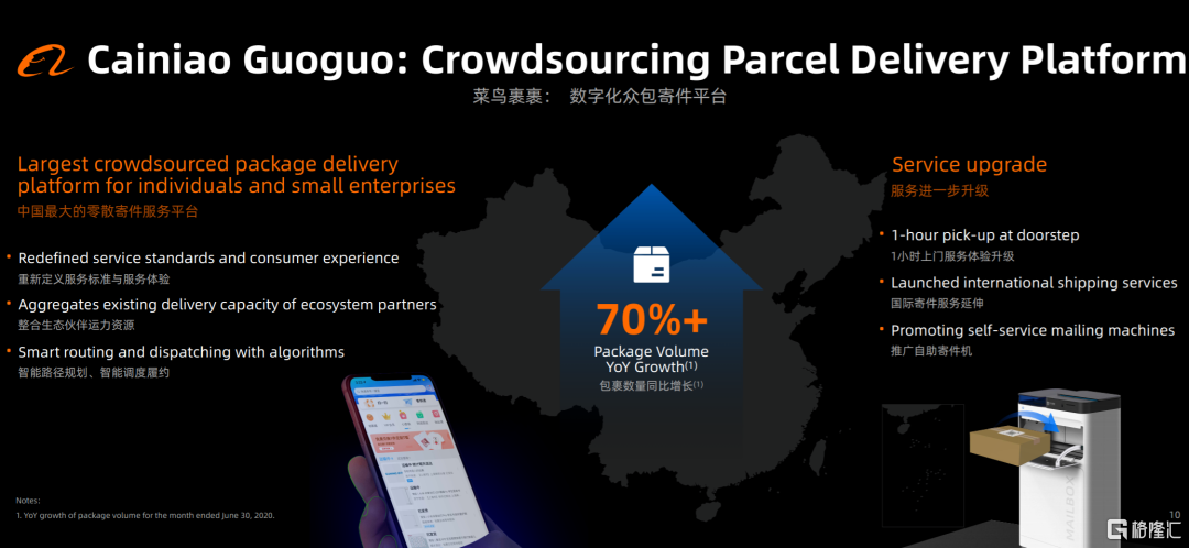 菜鸟的数字化众包寄件平台菜鸟裹裹则迎来了截至6月30日的70%的年同比增长。
