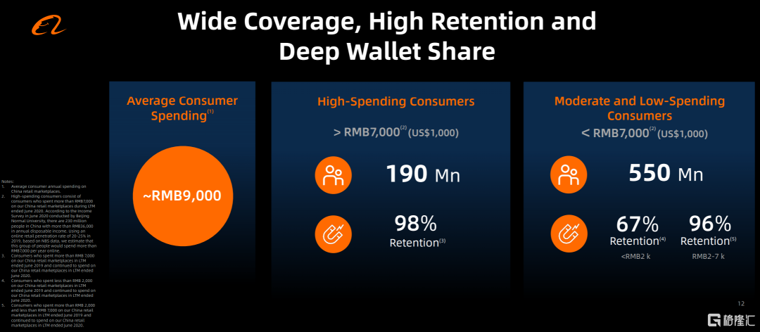 不仅如此,在阿里的零售平台,1.9亿高收入群体留存率达98%;另外5.5亿消费者的全年花费不到7000元,其中年消费在2000元以下的群体,这些很有可能是阿里平台上第一或第二年的新消费者,他们在平台上的留存率大约是67%。而年消费在2000-7000元之间的群体,留存率则达到96%,也非常高。