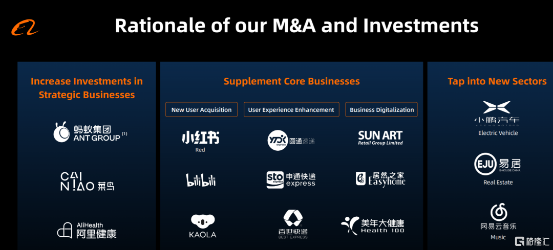 首先是围绕核心战略业务投资,比如蚂蚁、菜鸟、阿里健康等,阿里在过去一年中分别追加投资,提高了在这些公司中的持股比例。