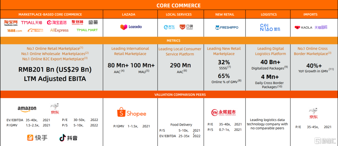 阿里给出了充分的理由:阿里过去一年商业板块里的核心交易市场业务的盈利(经调整EBITA)达到290亿美金,即便按市场给予同比公司的最低的估值倍数25倍计算,这部分业务价值就应达到7250亿美元,这个数字已经接近阿里巴巴目前的总市值。
