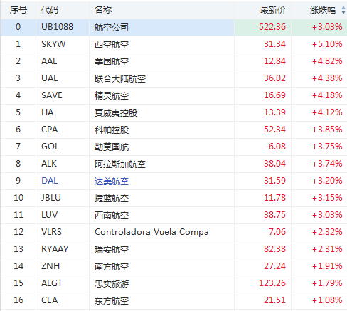 航空股中,截至发稿,西空航空涨超5%,美国航空涨4.82%,联合大陆航空、精灵航空、夏威夷航空涨超4%。