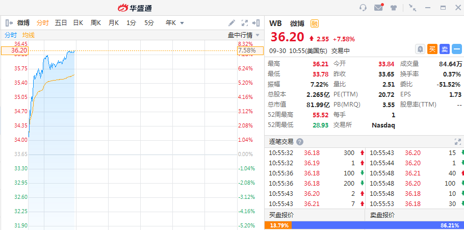 华盛资讯9月30日消息,微博今日股价高开高走,截至北京时间22:55,大涨近8%,报36.20美元。