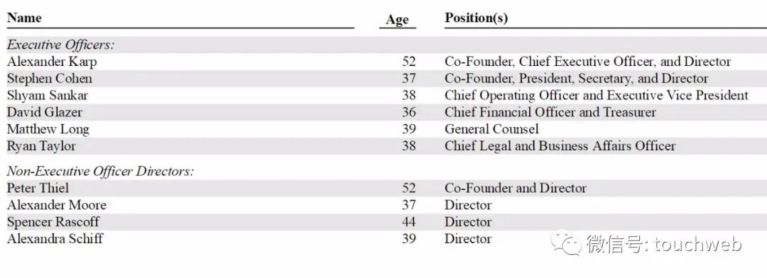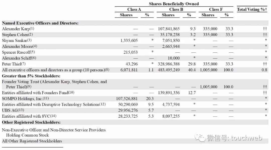 IPO前,Alexander Karp持有9.3%的B类股,及33.3%的F类股;Stephen Cohen持有3.2%的B类股,及33.3的F类股;