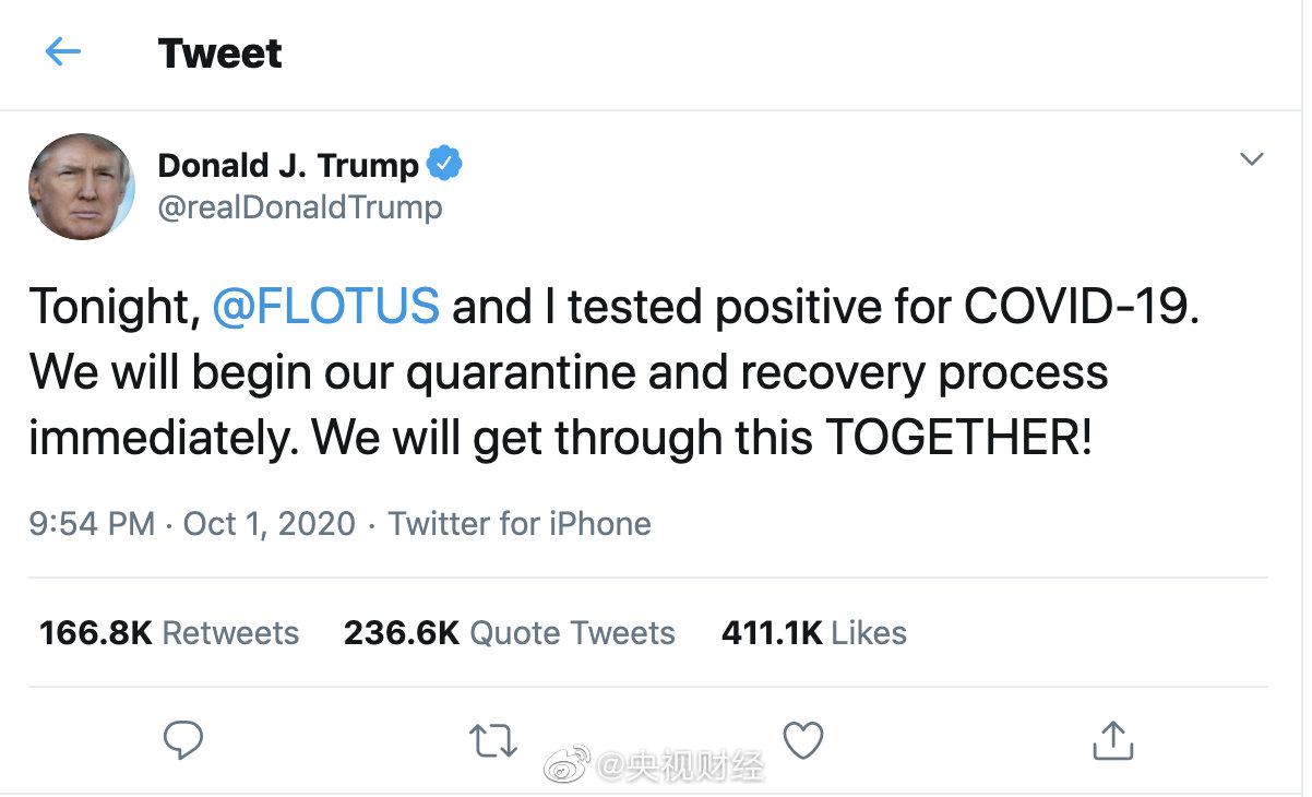 当地时间10月1日晚,美国总统特朗普发布推特表示,他和第一夫人梅拉尼娅·特朗普新冠病毒检测呈阳性。金融市场迅速反应,美股期货在盘前闻讯大跌,道指期货下挫超500点,跌幅1.8%,标普500指数期货下跌1.78%,以科技股为权重的纳斯达克综合指数下跌超过2%。