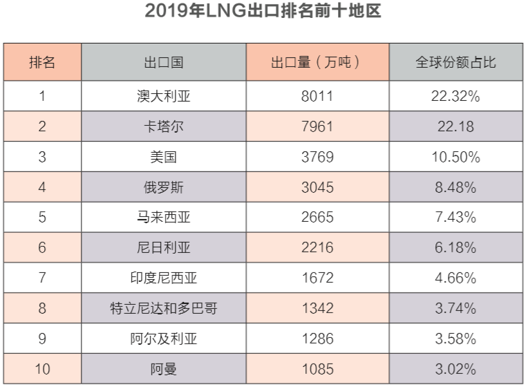 2019年中国进口LNG6025万吨,同比增速12%,受工业经济需求影响,进口增速回落。进口来源中前5名为澳大利亚(进口2780万吨)、卡塔尔(832万吨)、马来西亚(689万吨)、印度尼西亚(453万吨)和巴布亚新几内亚(242万吨),进口量占据中国LNG进口总量的83%。