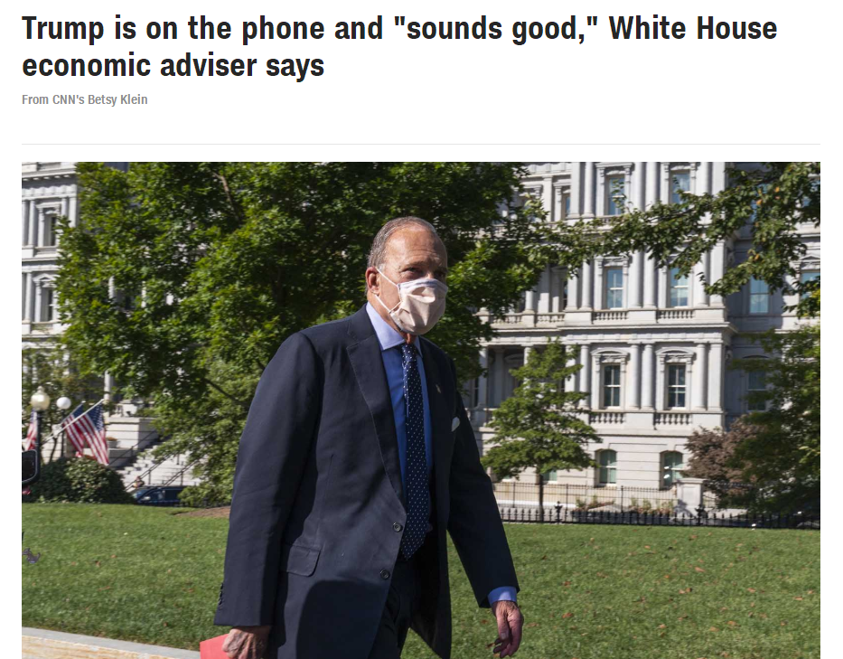 【环球网快讯】美国总统特朗普2日凌晨发推宣布自己和妻子梅拉尼娅新冠病毒检测呈阳性后,引发巨大关注。美国有线电视新闻网(CNN)消息,白宫经济顾问库德洛刚刚在福克斯商业频道露面,他表示特朗普正在“打电话”,“听上去还不错”。