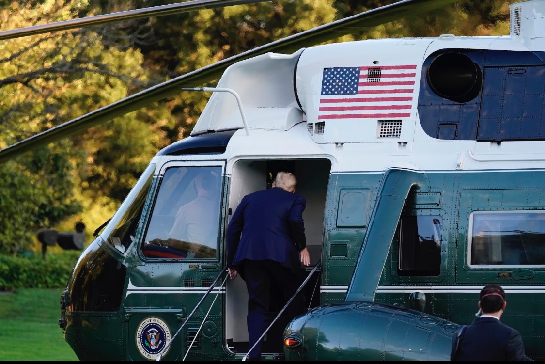 CNN最新消息称,特朗普2日下午18时06分从白宫住所走出来,登上海军陆战队一号直升机。他穿着西装戴着口罩向媒体挥手致意,但没有像往常一样停下来发表讲话。目前已经抵达沃尔特里德军事医院。
