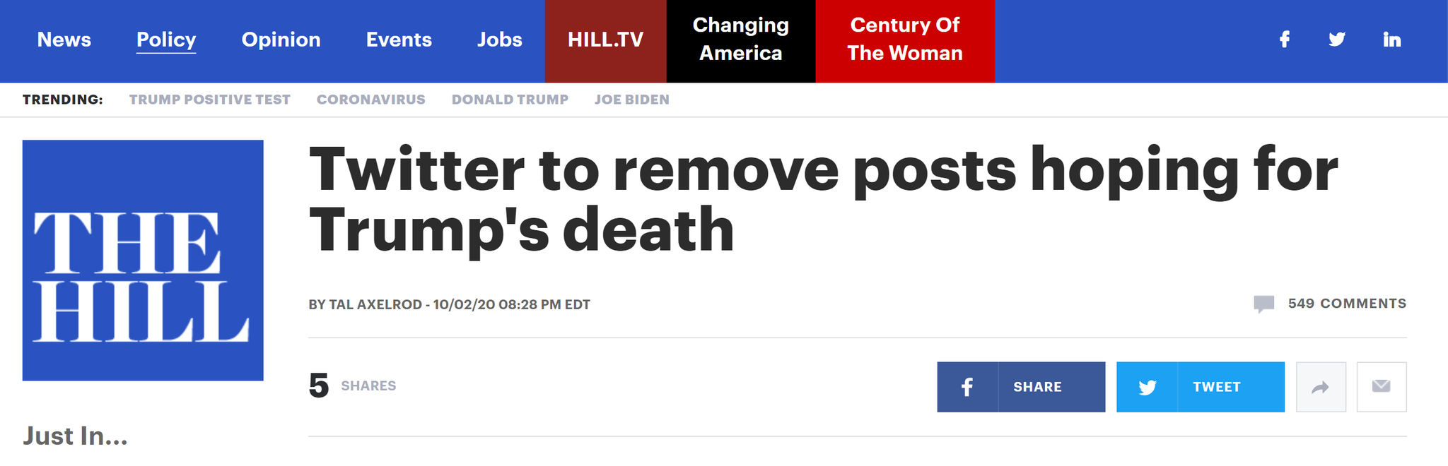 【环球网报道】美国《国会山报》报道称,社交媒体平台推特公司2日警告称,将删除平台上“希望特朗普去世”的帖文。当天凌晨,特朗普发推称自己和第一夫人感染新冠。