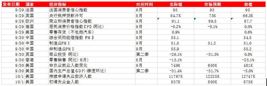 美股本周喜忧参半。数据方面,美国第二季国内生产总值(GDP)经修订后收缩31.4%,与一个月前估计的31.7%跌幅相差不大。美国首次申领失业救济人数在截至9月26日一周减少3.6万,至83.7万,低于市场预期的85万,为连续第五周低于100万的水平。续领人数亦减少98万,报1176.7万。而纾困计划反复,美国总统大选首场辩论在互骂声之中结束,民调显示民主党候选人拜登表现胜一筹,以及特朗普确认新冠,为市场带来不确定性。