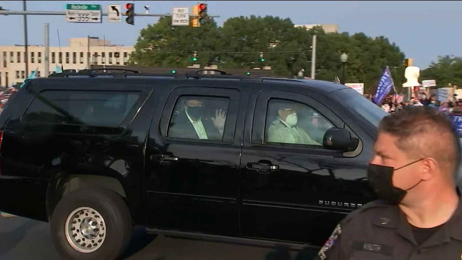 原标题:快讯!美媒:特朗普乘专车短暂离开医疗中心,向支持者致意
