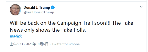 原标题:快讯!特朗普离开医疗中心前发推:很快将投入到竞选活动中,假新闻只展示假民调