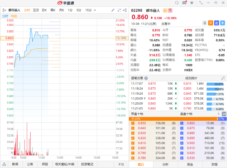 都市丽人(2298.HK)大涨逾13%,暂录得连续第七周上涨,报0.86港元,盘中高见0.91港元,较8月26日的低点0.42港元已经实现翻倍,最新总市值19亿港元。