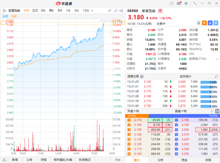 次新股乐享互动盘中涨幅持续扩大,以3.18港元刷新上市新高,截至15时33分,涨13.17%,报价3.18港元。