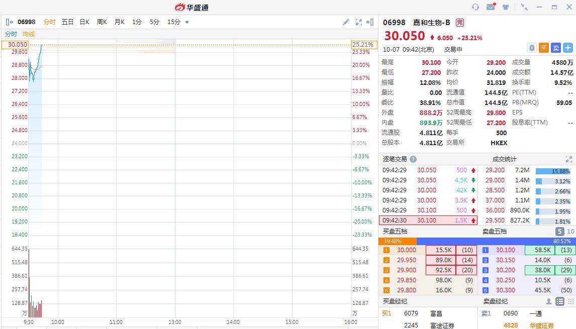 嘉和生物今日正式挂牌港交所,股价高开高走,目前大涨25%,一手浮盈超3000港元;该股昨日暗盘收涨31.67%,一手浮盈3800余港元。