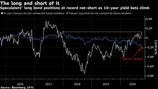 Sheets的建议反映在对冲基金持仓策略中,这些对冲基金对美国国债收益率曲线将趋陡--通常被视为预期通货再膨胀--的押注更为激进。最新数据显示,长期债券期货的投机性净空头头寸已创纪录,而10年期美国国债的净多头头寸已攀升至2017年10月以来的最高水平。