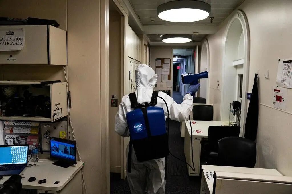 本周,包括简报室在内的白宫部分地区就像是一个危险区域。身着全套防护服的工作人员在对公共场所进行消毒。图源:《纽约时报》