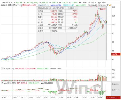不过iPhone 12即将发布的消息在凌晨出来后,10月6日,苹果股价却表现一般,虽然有小幅拉抬动作,最终还是跟随大盘大跌,最终收跌2.87%。