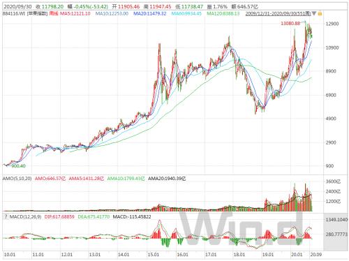 A股方面,近些年,苹果概念指数一直震荡向上。截止9月30日,苹果指数今年上涨21.77%。目前基本处于历史高位。