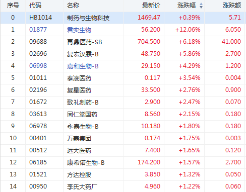 10月8日,港股生物医药板块走强,君实生物盘中涨幅一度扩大至12.06%;复宏汉霖-B涨5.86%,再鼎医药-SB涨超6.1%,次日上市的嘉和生物-B涨近4%。